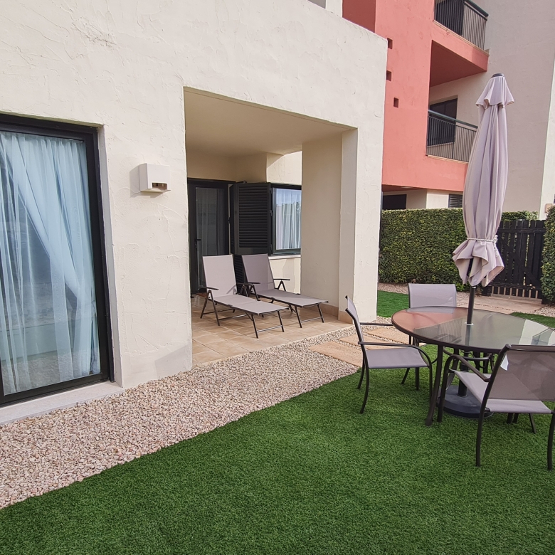 Exclusive ground-floor apartment located in the prestigious Corvera Golf resort. This elegant two-bedroom, two-bathroom property combines modern design with exceptional comfort. It features a spacious private garden with stunning views, creating the perfect setting to enjoy the peace and Mediterranean lifestyle.